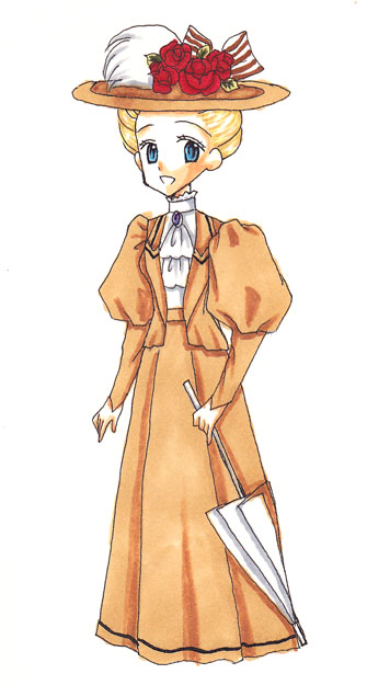 こういうつばの広い大きな羽根飾りの付いた帽子を被ってるイメージです。あとパラソル。