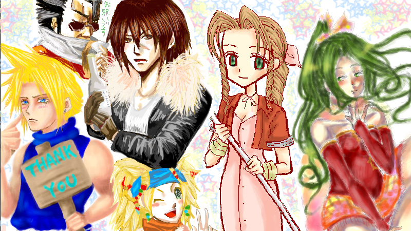 左からFF7よりしーちょいさんのクラウド、FF10よりえむさんのアーロン、スコール、リュック、FF7より小雨のエアリス、FF6より樹種さんのティナです。