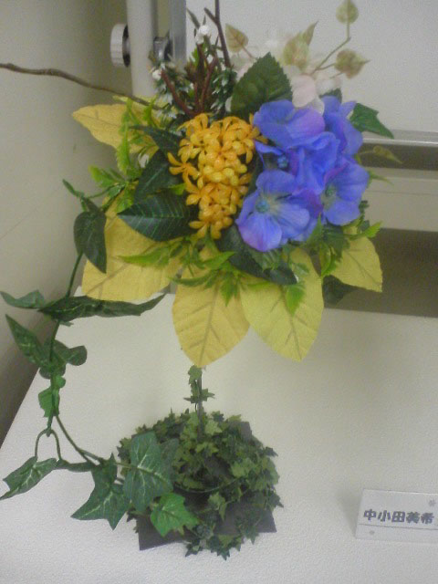 もう一つ美希ちゃんの作品。青いお花に補色の黄色が映えて大人っぽくもシックなイメージです。