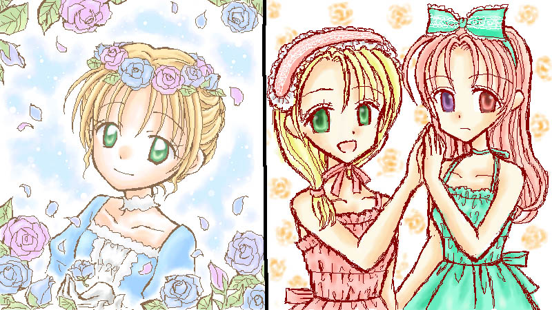 私は、前からずっと描きたかったリィナさんとミルさんのツーショットvyumiさんが5月31日に更新なさっていたせらさんとの絵チャログを見て、私もこのお二人でロリータっぽい物を…と思い、構図考えてました。