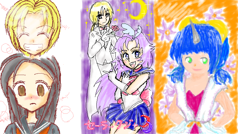 左から、小雨、アンさん、茶眼さんです。私の絵は色合いが貴史と透子みたいですが、ジタン(男の子ですよ念のため;;)とガーネット姫です。彼の笑顔にどきっ…の図です~王道ですねvアンさんのイラストは、セーラームーンをFF9のキャラでパロです(笑)そして茶眼さんは何と偶然にもけろチャをご存じでミモリ姫コスのエーコちゃんなのですよー!皆さんりぼんっこで盛り上がってました(笑)楽しかったですv
