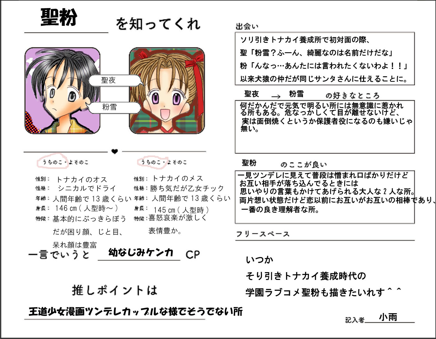 画像はTwitterで配布されていたCP紹介シートを聖夜×粉雪でやってみた物。