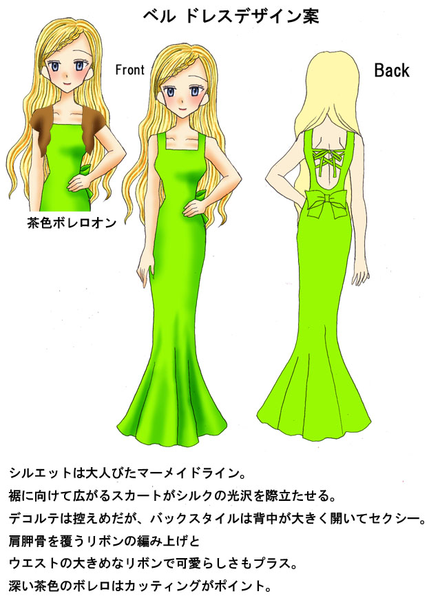 ドラムが見繕ったドレスを着た姿のデザイン画。